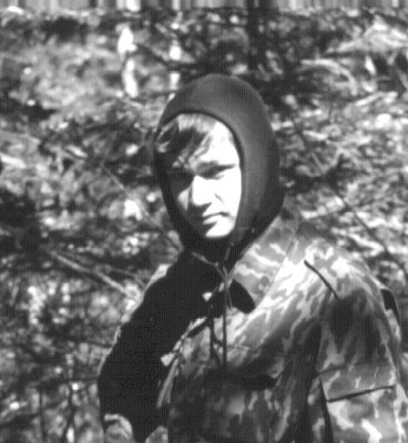 При подготовке топлива присутствовал Женя Ветрик (младший брат), здешний лесник (2 недели, как назначен). Естественно, завязался разговор о прошлой экспедиции, об охоте, о теперешней ситуации в Приморье и вокруг заказника. Его достопримечательной собственностью был огромный мачете, сделанный из листа толщиной 1,5-2 мм с лезвием длиной около 30-40 см. Конечно же, сделали групповой портрет на разные типы пленок. Так, слово за слово, вернулись в свой лагерь москвичи (примерно в 19.30) и было решено, что они пойдут в баню первыми, мы -- после, ограниченным составом. На том и порешили, а в лагере нас уже ждал ужин с оладьями и компотом из лимонника.