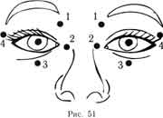 Большими пальцами захватите переднюю часть висков (в точках 4,
