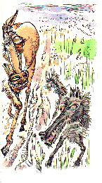 Вожак (делая большой прыжок). Замолчи, старая кляча! Догадалась-таки! Теперь держись!.. А ну, веди меня в табун! (Ловит Малыша.)