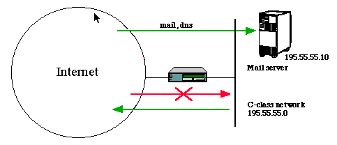 In this example, a company has Class C network address 195.55.55.0. Company network is connected to Internet via IP Service Provider. Company policy is to allow everybody access to Internet services, so all outgoing connections are accepted. All incoming connections go through "mailhost". Mail and DNS are only incoming services.