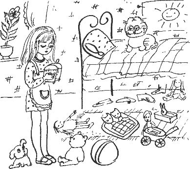 мокрые следы ведут в ее комнату. Вернулась, а там среди игрушек сидят два