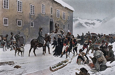 Генерал Бонапарт узнает у монахов Сент-Бернар путь через Альпы