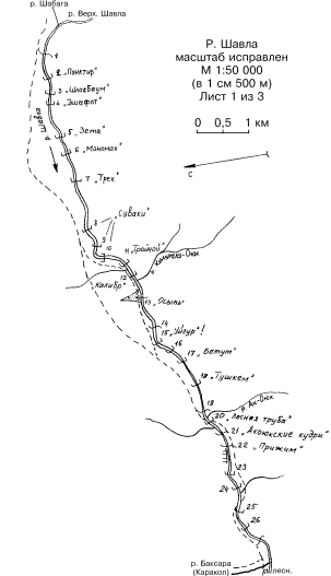 От поляны стапеля на стрелке Верхней Шавлы и Шабаги можно перейти на правый берег р. Шабага по поваленным деревьям. На протяжении первого-второго препятствий по правому берегу Шавлы идет хаотическая паутина троп, среди которых трудно выделить главную. Однако уже в районе 3-4 препятствий она собирается в одну хорошо заметную тропу. Далее на протяжении практически всего содержательного участка реки идет хорошая тропа или, в крайнем случае, две тропы: одна человеческая, вдоль борта долины, срезает излучины русла; другая туристская, идет непосредственно у кромки воды. До препятствий 29-30 тропа идет по правому берегу, обработка большинства препятствий - по нему же. Далее тропа переходит на левый берег, который становится опорным до пор. Неустроева включительно. На участке до пор. 21 Ак-Оюкские Кудри (включительно) настоятельно рекомендуется сплошной просмотр из-за возможных завалов, сложности ориентирования и недостатка чалок. Весьма часта ситуация, когда в пределах видимости действительно нет места для чалки, и даже возможность задержаться для кратковременного отдыха в относительно спокойном месте имеется не всегда.