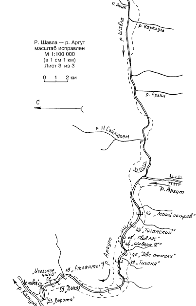 3. Пор. Шлагбаум. Начинается от указанного места чалки шиверой на прямом участке. Река подмывает левый берег, деревья свисают в воду. В начале местного правого поворота крохотный островок с кустами, отделенный от правого берега сухой протокой. За ним вся струя сваливает вправо через поле обливных камней. Далее сужение в воротах из крупных камней. В конце справа удобная чалка между камнями, стоянка, ниже стоянки впадает чистый ручей.