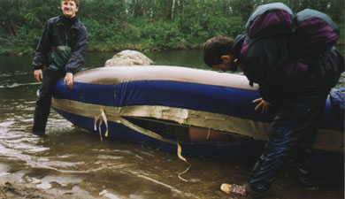 После порога река разливается, становится мелкой. Основная струя резко уходит влево. При удачном прохождение котла туда и выносит. Таймень успешно положило, вынесло на камни и поломало. За порогом в 100 метрах на левом берегу начинается дорога, которая через 3 км выходит на "ковдорский тракт". По "тракту" еще около километра до дамбы. И еще полтора до поселка. В связи с поломкой Тайменя и необходимостью встретить в поселке экипаж Нерпы, было решено закончить поход. Прохождением водопада и оставшихся порогов пришлось пожертвовать.