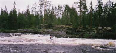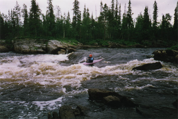 (Чего стоил камень размером с голову, который случайно завалился через дно и остался в лодке.) После Печозера начинаются пороги. Порог-плес-порог - как типичная карельская речка. Первые 2-3 - небольшие. Короткие и маленьким падением. Здесь и далее у всех неприятная черта - струя на выходе из порога как бы "размывается", становится мелкой, камни вылезают на поверхность. Много неприятностей это доставляло Тайменю. После примерно полукилометрового плеса начинается порог, который, как и большинство последующих можно назвать "Кривым". Прямой участок перед ним, высокий правый берег. Порог начинается и сразу уходит влево почти под прямым углом. Прямая после поворота струя, много обливных камней, за которыми кроются маленькие, коварные для начинающих каякеров улова. После порога, как водится, обширный плес. Следующий значительный порог - "Падун". За левым поворотом, хорошо слышен. Просмотр слева. "Падун" как "падун", ничего особенного.