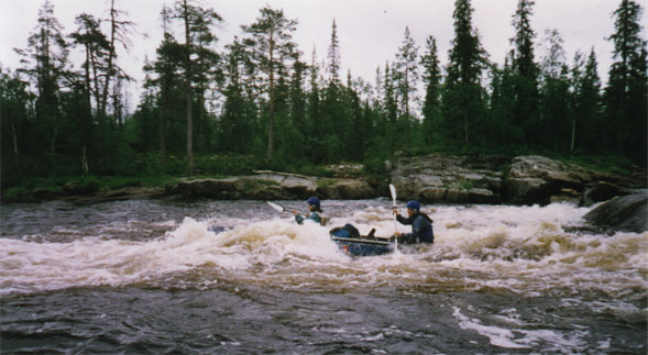 После слияния Печи и Аллоя речка выполаживается, становится значительно глубже. Плесы чередуются с небольшими каменистыми шиверами, на некоторых из которых Таймень и КНБ приходилось по-прежнему проводить. Четко выраженных порогов нет. Такая картина сохраняется до моста через Печу. Перед мостом кончается территория заповедника. Появляются рыбацкие стоянки по берегам. Плесы становятся длиннее, шиверы все такие же мелкие, короткие. Этот занудный участок продолжается почти до Аксозера. Перед Аксозером шивер становится несколько больше, много хороших стоянок, неплохие места. После Аксозера на час гребли по абсолютно спокойной воде. Развлекали только многочисленные скворечники на соснах по берегам. Кто их вешал? После разделения Печи на две протоки начинается порог. Это первый порог на Пече после верховьев. Достаточно высокие валы, струя четко выраженная и в основном прямая. Приятное развлечение после гребли по спокойной воде. После впадения Коньи - плес до Печозера. От впадения шли 1.5 часа ненапряжным темпом. Печозеро нам показалось короче, чем оно нарисовано на карте. Стоянок на правом берегу не нашли. Мост в конце Печозера сгорел. Встали у дороги на левом берегу. Стоянка очень грязная - сказывается близость "ковдорского тракта". От этого места экипаж КНБ ушел пешком в Верхнетуломский, т.к. в предыдущий день дыра в шкуре их лодки достигла фантастической длины - двухбаллонная Нерпа превратилась в катамаран со всеми втекающими и вытекающими последствиями.
