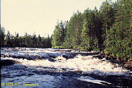 Порог No45 (п. Корней-порог) (Длина 90 м). В отчете No2800 ЦМТБ Корней-порог квалифицирован как IIIа, что, наверное, справедливо для высокой воды. При любом более низком уровне воды этот порог, по-видимому, непроходим для байдарок. Виной тому -- начальная часть (20--30 м), представляющая собой мощный поток через хаотическое нагромождение мелкосидящих валунов при полном отсутствии свободы маневра. После краткой паузы (5--10 м) -- мощный слив 1.5--2 м с камнями в струе. При желании можно провести по правой протоке до паузы и пройти только слив (КНБ). Обнос-проводка всего порога также вдоль правого берега. Сразу за порогом -- мелковатая выходная шивера (100--150 м). Через 10 мин --