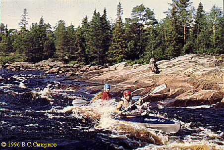 Порог No26 (Iб, 150 м). Глубокая шивера, хорошо просматриваемая с воды. Сходу. Через 150 м --
