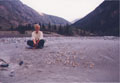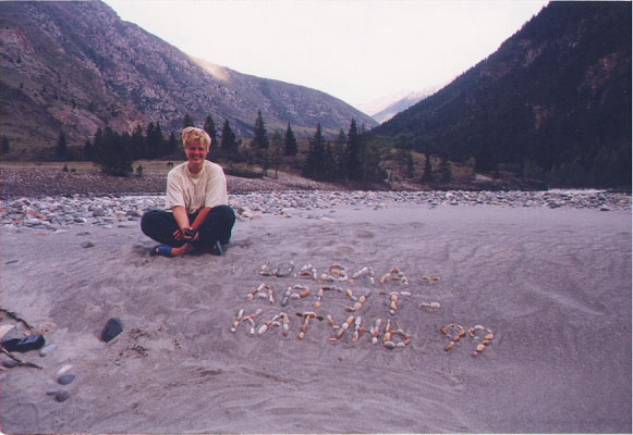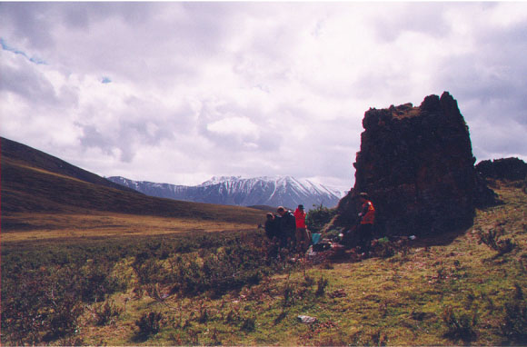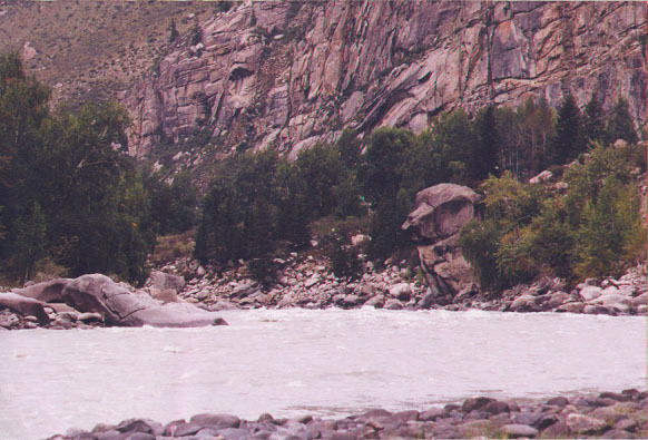 Прибыли в Барнаул в 6:05 по Москве (9:05 местного). После непродолжительной разведки решили в Бийск ехать автобусом. Ближайший автобус на Бийск отправлялся в 10:00 по местному времени. Автовокзал находится рядом с железнодорожным вокзалом. Сделали звонок водителям машины, с которыми договорились еще в Москве.Через три часа были в Бийске, в условленном месте, где нас ждал ГАЗ-66. Из Бийска отъехали в 13:00. По словам водителей ехать примерно 12 часов, не считая остановок на отдых и еду. Решили ехать с таким расчетом, чтобы у поворота с Чуйского тракта быть на рассвете. На обед остановились на берегу Катуни в курортной зоне. Ужинали уже в сумерках. У какого-то ручья на Чуйском тракте. Ночью пытаемся спать на рюкзаках. С каждого борта машины в фургоне умещалось по 6 человек. Пьем пиво, поем песни. Почему-то песня А.Городницкого "На материк, на Магадан" стабильно "вызывает" гаишника. Причем не дух, а вполне материальное тело, жаждущее денег. После третьего раза, от попытки допеть эту песню до конца пришлось отказаться. К повороту с Чуйского тракта в горы (п. Чибит) подъехали в 5:00 утра.