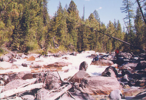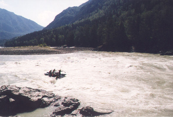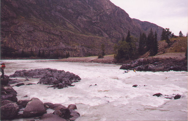 Завтрак в 8-00. В 10-00 вышли к судам и перечалились чуть ниже места ночевки. Решили дальше идти загруженными. Один человек с рацией ушел на просмотр до пор.Мономах. Завалов нет, шиверу Зета идем сходу. Первым пошел "Тритон". Перед Мономахом места для чалки мало. Разведчик просигналил и подстраховал на месте чалки. Остальных ловил экипаж "Тритона". Порог Мономах вопреки ожиданиям оказался значительно проще Эшафота. Начали прохождение до того, как подошло последнее судно. Первым шла двойка "Тритон". Прошли чисто, зачалились после выходной шиверы в правой протоке на ПБ на хорошей стоянке. Далее прошла черная двойка. Тоже без приключений. Затем шел "Голубой Дунай". В выходной шивере с навалом на камни ПБ они эти камни слегка переехали. Красная четверка села на камень в основном пороге, но быстро сошла и успешно прошла все остальное. Через 50м ниже стоянки крутой левый поворот и прижим к завалу на правом берегу. Это начало порога Трек. Пошел разведчик с рацией до следующей чалки. За левым крутой правый поворот и за ним основной слив в узких воротах. За сливом свисает с правого берега береза и верхушкой полощется в воде. Неприятно, но обойти можно. Через 30м за березой есть место для чалки на галечной отмели правого берега. Дальше начинается участок быстротока около 300м в разбоях у островов. Просмотрели на предмет завалов и пошли дальше. Затем крутой левый поворот, река растекается среди галечных отмелей. На них завалы. За крутым правым поворотом начало каскада Сувак. Встали на обед на левом берегу перед отмелями. Вокруг нетронутые кедры с шишками. Народ с увлечением занялся древнейшей профессией человека - собирательством. Капитаны катамаранов и все желающие просмотрели дальнейший участок сплава до пор.Калибр. На участке около 2 км пороги следуют один за другим. Чалка и место для стоянки на ЛБ есть после порога Тройной. Решили идти до впадения левого притока Кмурглу-Оюк (после пор.Калибр). Самое сложное место - пор.Тройной. На заходе лавировка между камней. После основного слива навал на полуобливной камень в центре струи. В пороге Калибр узкий слив между двух каменных глыб. Первой шла двойка Тритон. Прошли нормально и благополучно зачалились у стоянки на правом берегу, напротив притока. У стоянки участок спокойной воды и большое улово. Остальные суда страховали с воды с помощью первой двойки. Черная двойка прошла чисто. "Голубой Дунай" навалило на камень в пороге Тройной, но смыло. Красная четверка с трудом пролезла в габаритный слив порога Калибр. В 17-40 последнее судно зачалилось у стоянки. Ночуем здесь. Солнце еще высоко, что благоприятствует стирке и помывке.