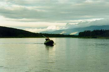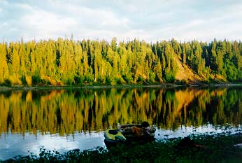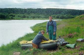 Когда немного прошли вниз, совсем неподал¤ку приземлился вертол¤т, но сразу улетел. Изредка по берегам попадаются лодки, но людей не видно. Ближе к вечеру встретили группу, которая шла с Торговой на рафте.