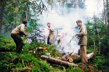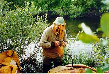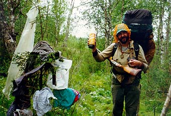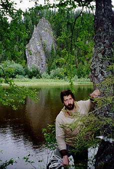 С утра пораньше, завидев дым разведенного Васей2 костра, заявился инспектор нац. парка Гаврилов с ржавым ружьем и напарником Димой. Как выяснилось- это главный человек на этой реке. Он проверил документы и выпил чаю, насыпав в кружку примерно полпачки заварки. Затем он проч¤л лекцию по кинологии, поведав об особенностях разведения западносибирских лаек. Поговорили о ловле рыбы. Гаврилов сокрушался, что трудно достать хорошие бл¤сны. Пришлось подарить парочку. Заодно Кира презентовал ему два патрона. Напоследок инспектор Гаврилов одарил нас тремя малосольными хариусами и флакончиком репеллента, а Дима снял нас видеокамерой. Инспектор Гаврилов стал еще одним символом похода. Не проходило и дня, чтобы его имя не поминалось.