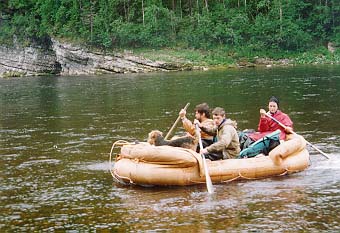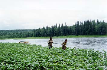 Сам Подчерем - речка очень красивая, и вобщем то для подьема вверх неплохая - по берегам почти всюду каменистые отмели - что-то типа тропы-бечевника (о подьеме на веслах забудьте сразу - и бечевой то в одни руки не всегда байдарку можно вытянуть), однако: по берегам многометровой полосой растут некие местные кувшинки ("лопухи") - течения в них естественно никакого - никаким корабликом на пятнадцать метров байдарку от берега не отведешь, веревка цепляется за лопухи, байдарка зарывается в лопухи, затем тыкается носом в берег - приходится, ныряя чуть не по уши, выводить ее на чистую воду - и так каждые двести метров. На подьем до верховьев Подчерема нужно отводить десять дней минимум (плюс обязательно одна дневка - задалбывает подобное время препровождение ужасно). От типа судов скорость подьма практически не зависит - у нас были ПСН и "Егерь", а паралельно шла группа каких-то уральских ребят на Салютах - шли примерно в одном темпе - то мы их обгоняли, то они нас.