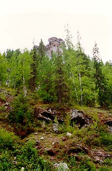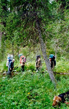 Вышли в 12.20. Идя по прежнему азимуту, прошли до зимника. Пошли по нему. Местами зимник можно опознать только по зарубкам на деревьях. Мы поняли, что слишком забрали к югу. Немного пройдя по зимнику, свернули с него и пошли по азимуту 30, а примерно через 30 мин. - 45. Начали подниматься в гору. Идти стало сложнее. Шли переходами по 100-150 метров, останавливаясь минут на 15. Погода совсем испортилась - дн¤м ни единого облака, жарко.