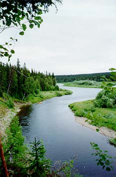 Как я уже сказал волок у нас был почти три дня - и не долиной (бурелом, кустарник), а через перевальчик по осыпям ... Вышли мы на ручей впадающий в Тельпос, вырубили в прибрежном ивняке площадку, надули прямо на воде ПСН - наконец-то сплав!!! Тельпос - практически сплошная несложная шивера, примитивная лавировка, даже и выделить в общем-то нечего ... 60-70 км - полтора дня.