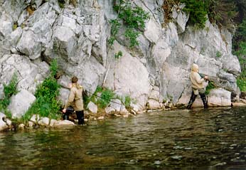 Немного об общем антураже - кроме того, что места очень красивые (действительно потрясающе красиво), еще и очень изобильные - грибов и ягод как грязи, ловля хариуса на муху - занятие чисто механичекое - стравливаешь мушку под перекат, вытягиваешь, снимаешь харю, стравливаешь и т.д. - за полчаса - десяток как здрасьте.