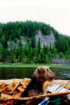 В 13.45 мы пересекли Печору и остановились на левом берегу перед Усть-Щугором. Когда выбрались на берег, Билл первым делом пош¤л знакомиться с местной фауной. В качестве е¤ представителя он выбрал зайчонка. И побежал за ним. Догнать его удалось быстро, а что делать дальше, он не знал. Так и бежал за ним в двадцати сантиметрах, пока не запутался в кустах.