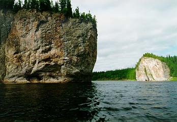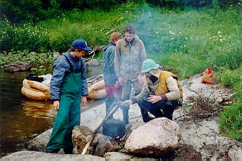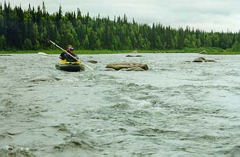 Когда мы подходили к камню, оно было левее нас, а когда "Егерь" уже был слева от камня, ПСН вдруг оказался правее и "Егеря" и камня. Байдарку на его месте просто размазало бы по камню, а ПСНу хоть бы что (за весь поход ни одна надувная часть его не была пробита). Сполз правее камня и пош¤л дальше. Правда, спящие в н¤м получили утреннюю информацию о температуре и степени свежести воды и насладились предчувствием кораблекрушения и команды "Полундра". Встали на завтрак в 7.00 не доходя Средних ворот. Вскоре морось исчезла и вышло солнце.
