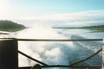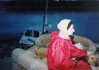 На это раз будильник в 4.50 услышали все. Но уже через две минуты наш судоводитель, которого все там зовут "Таксист", приш¤л и сказал, что двигатели он уже зав¤л. Бегом перетащили вещи. Расположились так'. три человека в каюте, двое- на корме. Тут то как раз и погода наконец исправилась- вышло солнце. Этот катер действительно оказался очень быстрым- в 8.40 мы уже были в Вуктыле. "Таксист" нас проводил до остановки автобуса.