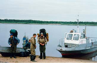 Уезжали мы из Москвы 1-2 августа поездом на Лабытнанги до Печоры. Приходил поезд на место часа в два ночи, а где-то в семь утра - "Заря" - семь часов вверх по течению Печоры, ветер, жуткая вибрация, с рюкзаками привязанными на крышу кое-как - в спешке и суматохе, с отдельного разрешения капитана - в общем приключения начинаются.