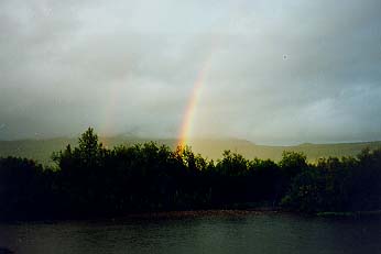 Встали в 19.00 на левом берегу с высокой травой. Сразу же развели кост¤р и стали греться. На противоположном берегу была очень яркая радуга.